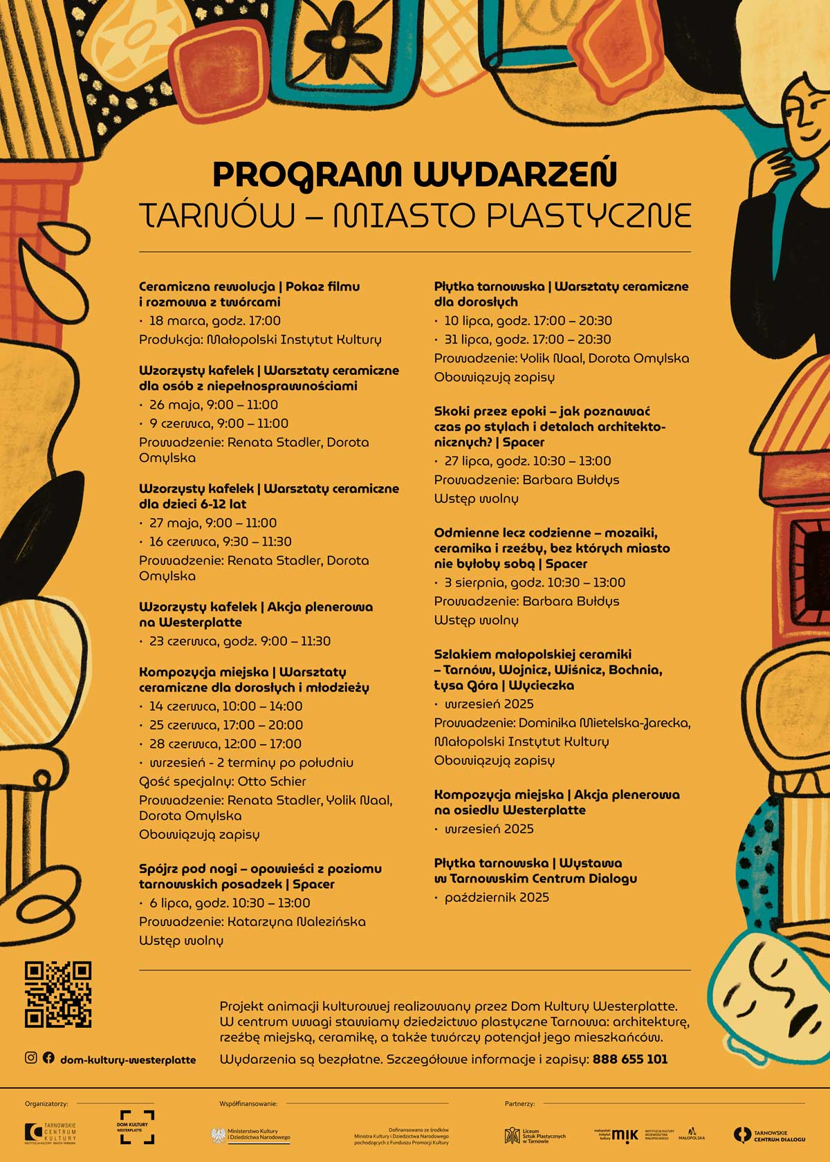 „Tarnów – miasto plastyczne” to projekt animacji kulturowej poświęcony dziedzictwu plastycznemu Tarnowa. Skupiamy się na architekturze, mozaikach, rzeźbie miejskiej, ceramice i detalach, które współtworzą charakter przestrzeni – zarówno tych obecnych, jak i tych, które zniknęły z miejskiego krajobrazu. Projekt łączy edukacyjne spacery miejskie, nastawione na uważne patrzenie, z twórczymi warsztatami ceramicznymi. Miasto traktowane jest jako materia plastyczna i wspólna przestrzeń – zmieniająca się pod wpływem zaangażowania mieszkańców. W ramach projektu realizowane są: warsztaty ceramiczne dla różnych grup wiekowych, otwarte spacery, pokaz filmu dokumentalnego Ceramiczna rewolucja, tematyczna wycieczka po Małopolsce oraz działania plenerowe. Wszystkie aktywności przygotowano z myślą o tym, by w przystępny i inspirujący sposób przybliżyć bogactwo architektoniczne i plastyczne Tarnowa możliwie szerokiemu gronu odbiorców. Szczegóły dostępne są w harmonogramie.