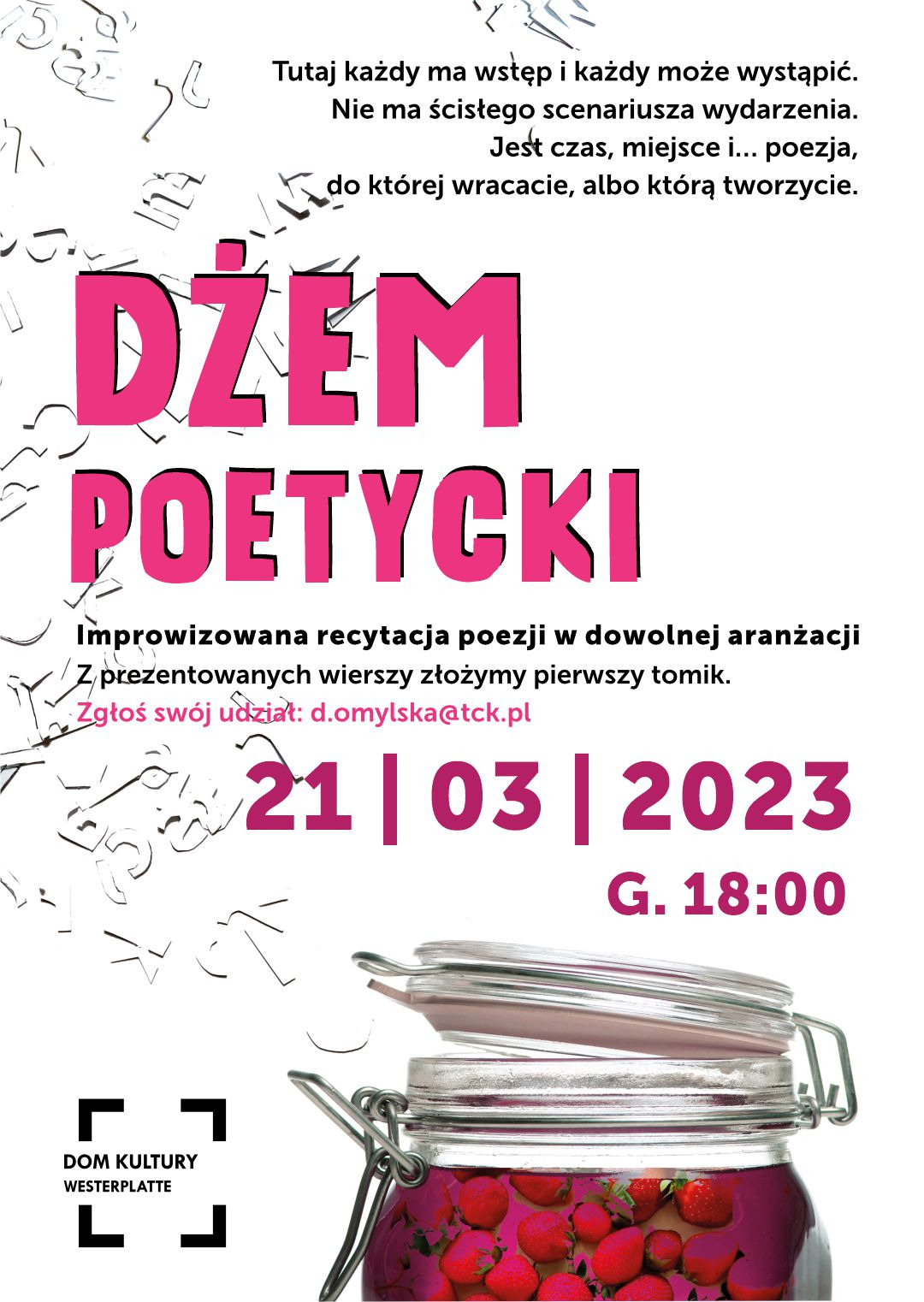 Osoby chcące zaprezentować swoje wiersze prosimy o zgłoszenia mailowe do koordynatorki projektu Doroty Omylskiej: d.omylska@tck.pl