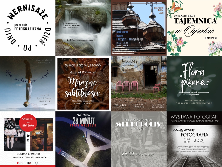 Cykl wernisaży jest pewnego rodzaju podsumowaniem i prezentacją działań Pracowni Fotograficznej działającej w Tarnowskim Centrum Kultury. Zajęcia prowadzone przez profesjonalistów z Tarnowskiego Towarzystwa Fotograficznego oraz osób zaprzyjaźnionych prowadzone są w trzech grupach: początkującej, zaawansowanej oraz dziecięcej. Zapraszamy do zapisów na nowy semestr – w Biurze Obsługi TCK (Rynek 5, Tarnów). Kliknij tutaj po więcej informacji.